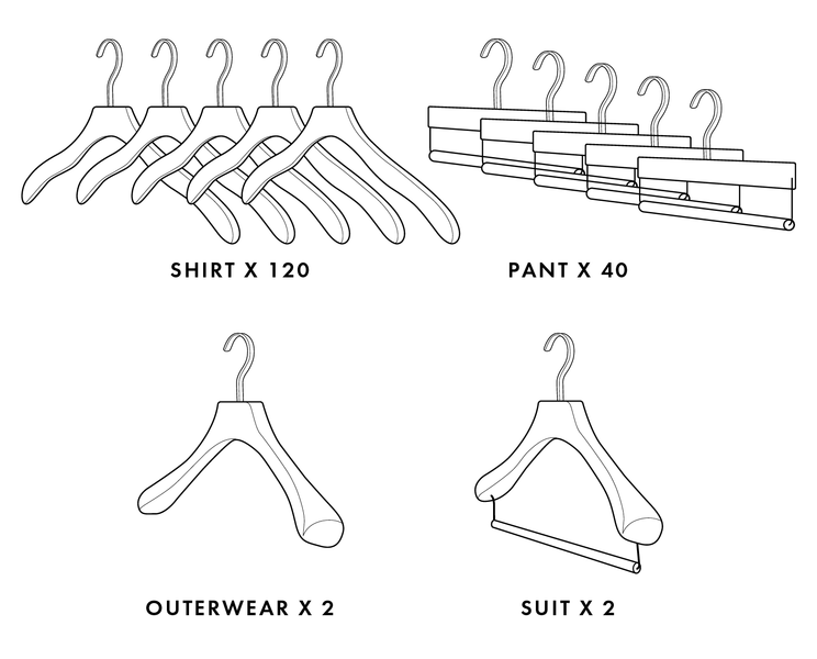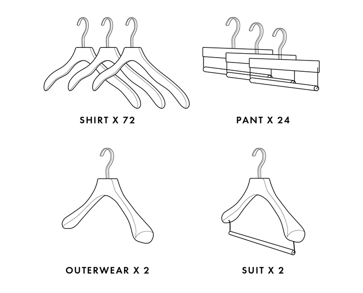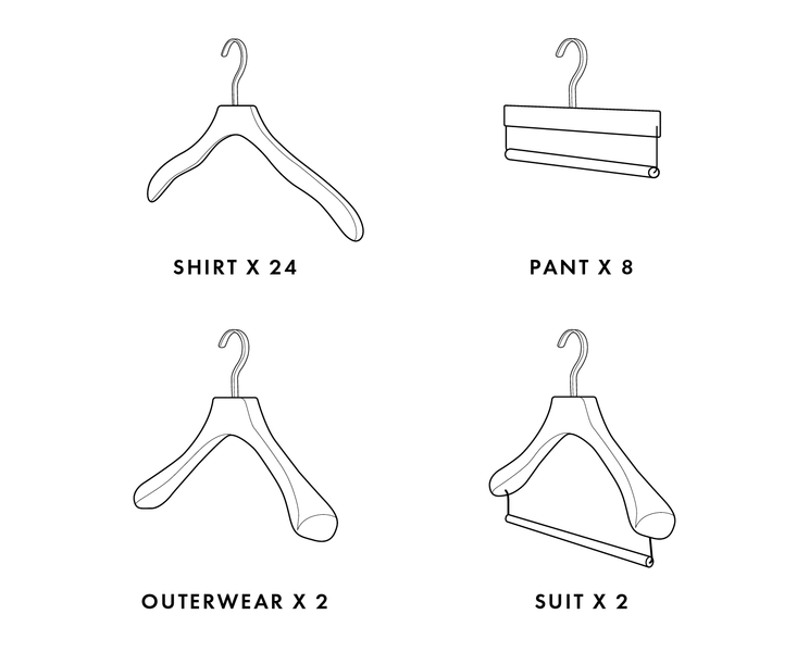 Avoid the “hanger dimple” in your clothes by choosing the right size hanger. Use the size chart below to identify the option that most accurately describes your fit and wardrobe. You can also customize the quantities of your base bundle to fit your closet needs.